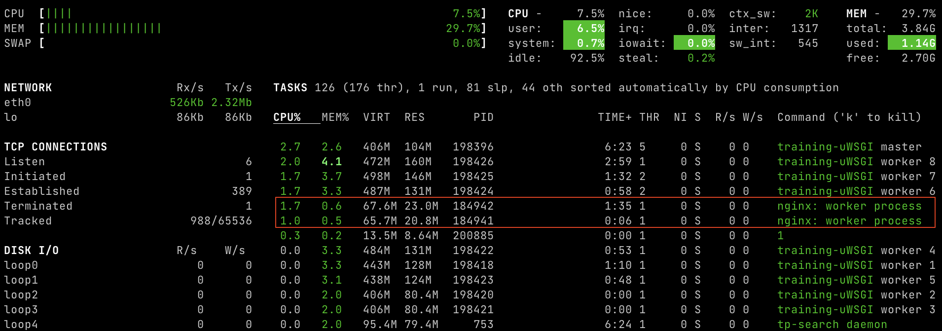 7.5% CPU usage total and only 3% across both nginx workers.