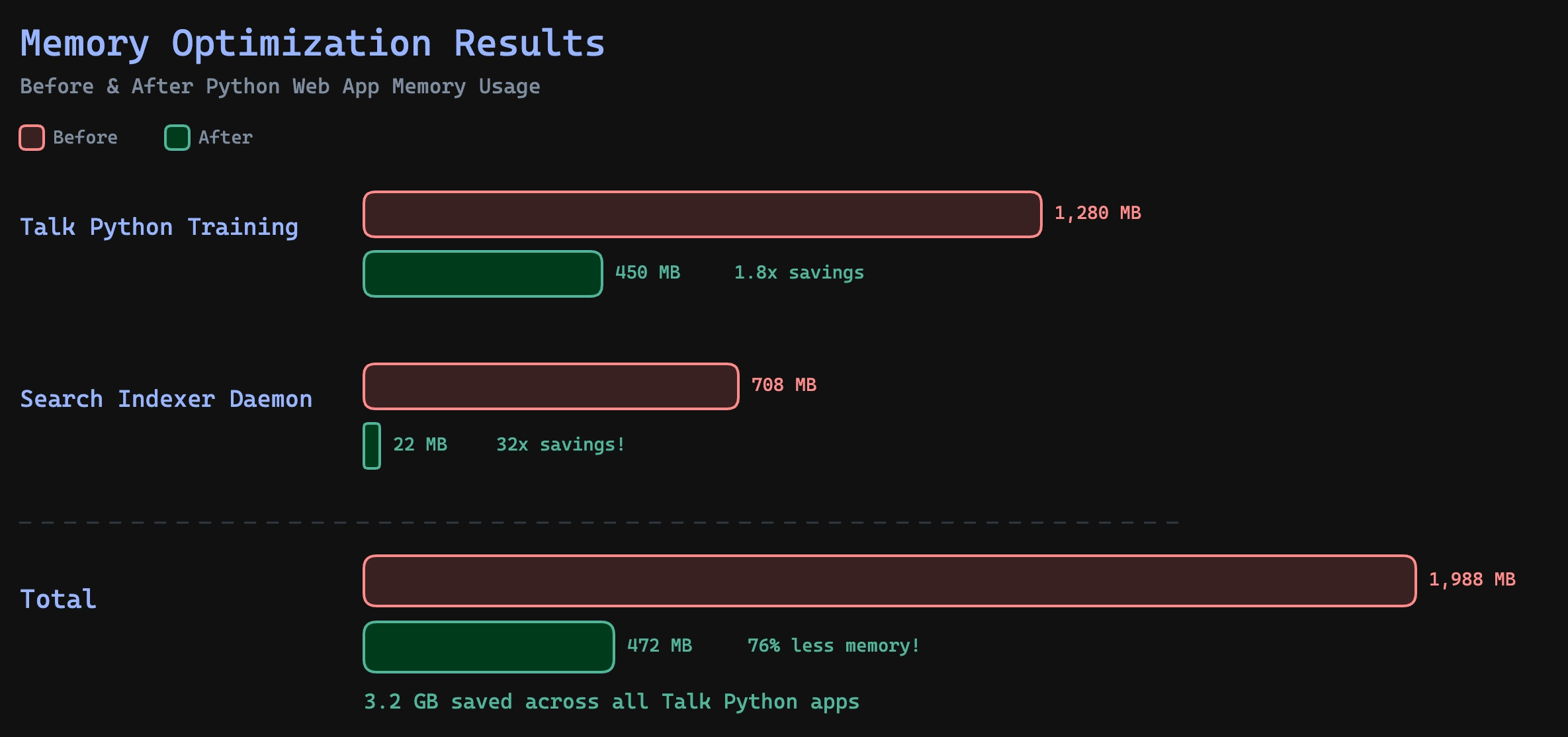 Over the past few weeks, I’ve been ruthlessly focused on reducing memory usage on my web apps, APIs, and daemons. I’ve been following the one big server pattern for deploying all the Talk Python web apps, APIs, background services, and supporting infrastructure.