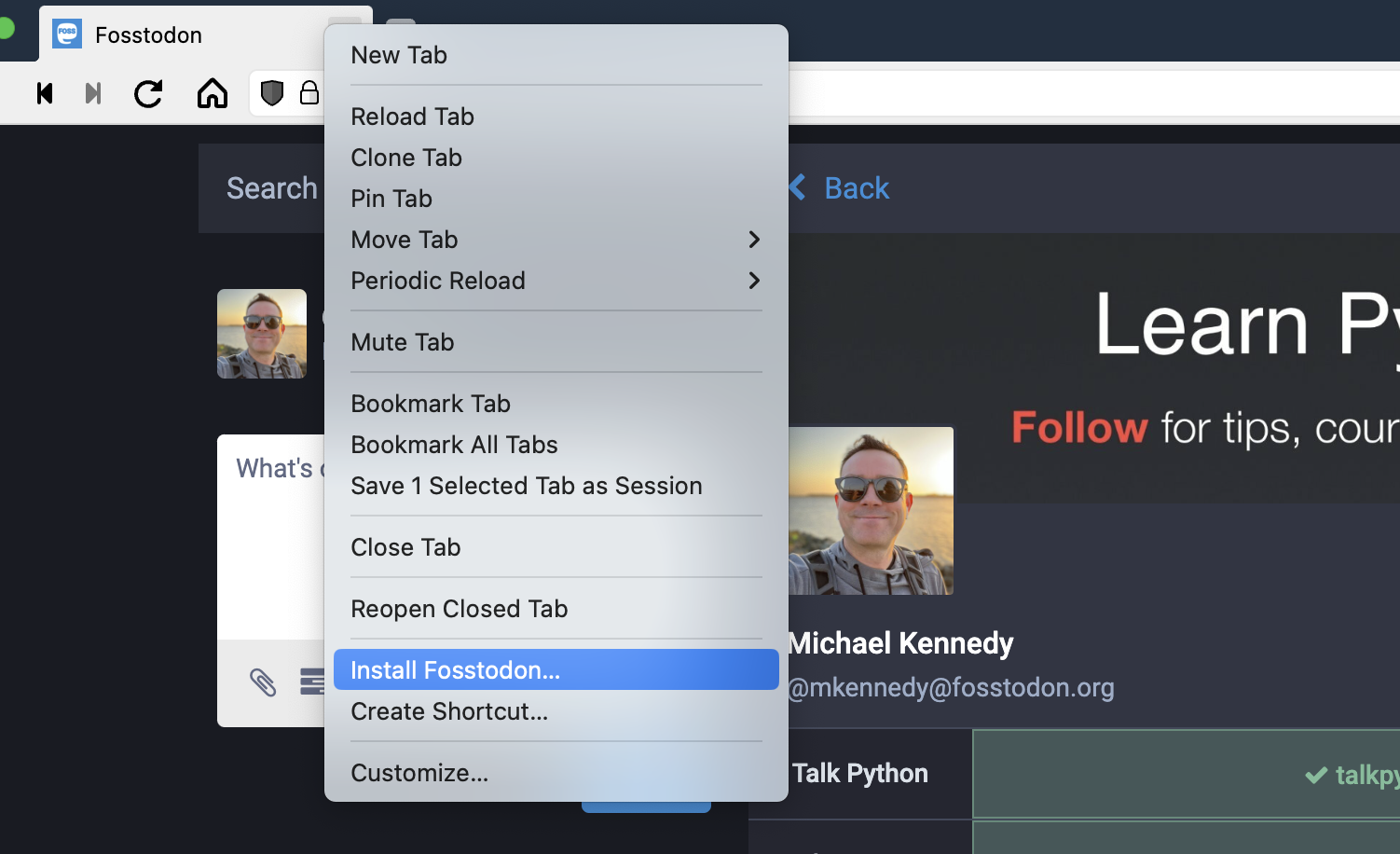 A full desktop app: Luckily the Mastodon folks have done the hard work to make the web app (that’s yourinstance.org, e.g. fosstodon.org) a Progressive Web App that can be installed with a single right-click and runs as a perfect app on your machine: