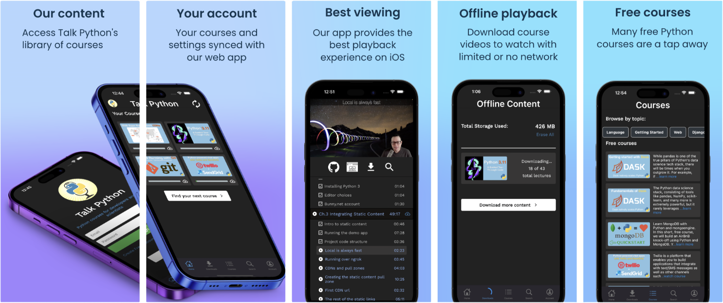 If you like this new version of the Talk Python courses app, please consider taking a few minutes to review it at your platform’s app store. It’d make a big difference to us. Many of the existing reviews are either very old or are complaints about issues with the old version. Help us give the app’s public face a clean up.