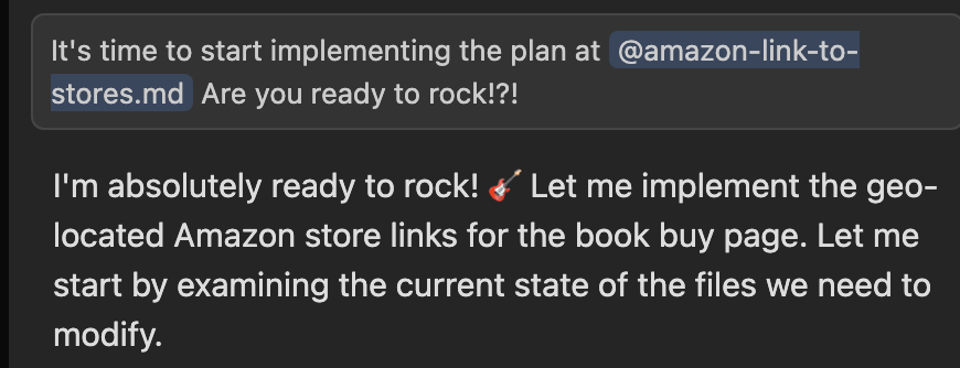 I’m really enjoying this. I think going forward, each time I kick off one of these detailed, plan-based projects, I am going to hype my AI coding buddy. Even if it doesn’t make a difference, it makes it more fun. :)