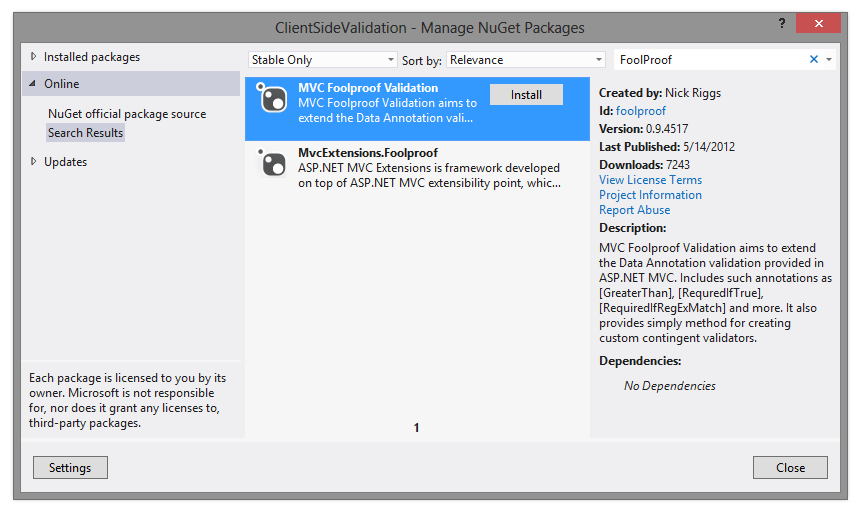 Jump over there and browse through the various attributes available. There are a bunch, such as RequiredIfTrue. Like so many things with ASP.NET MVC, the way to add foolproof to your project is to use NuGet. Just fire it up and search for FoolProof: