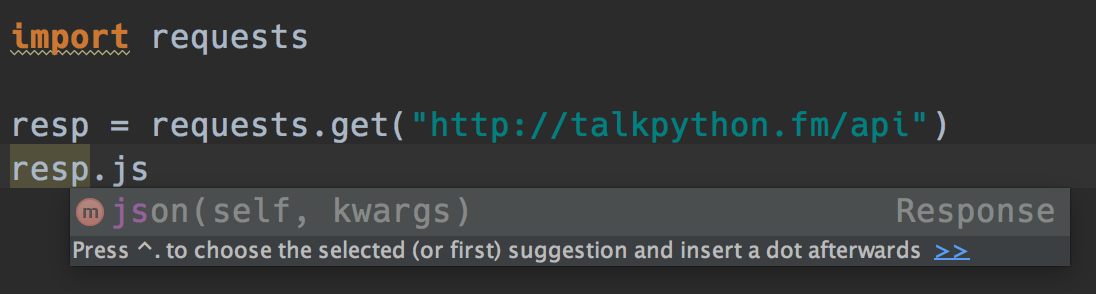 PyCharm has great code completion, whether it’s for a built-in or an external package.
