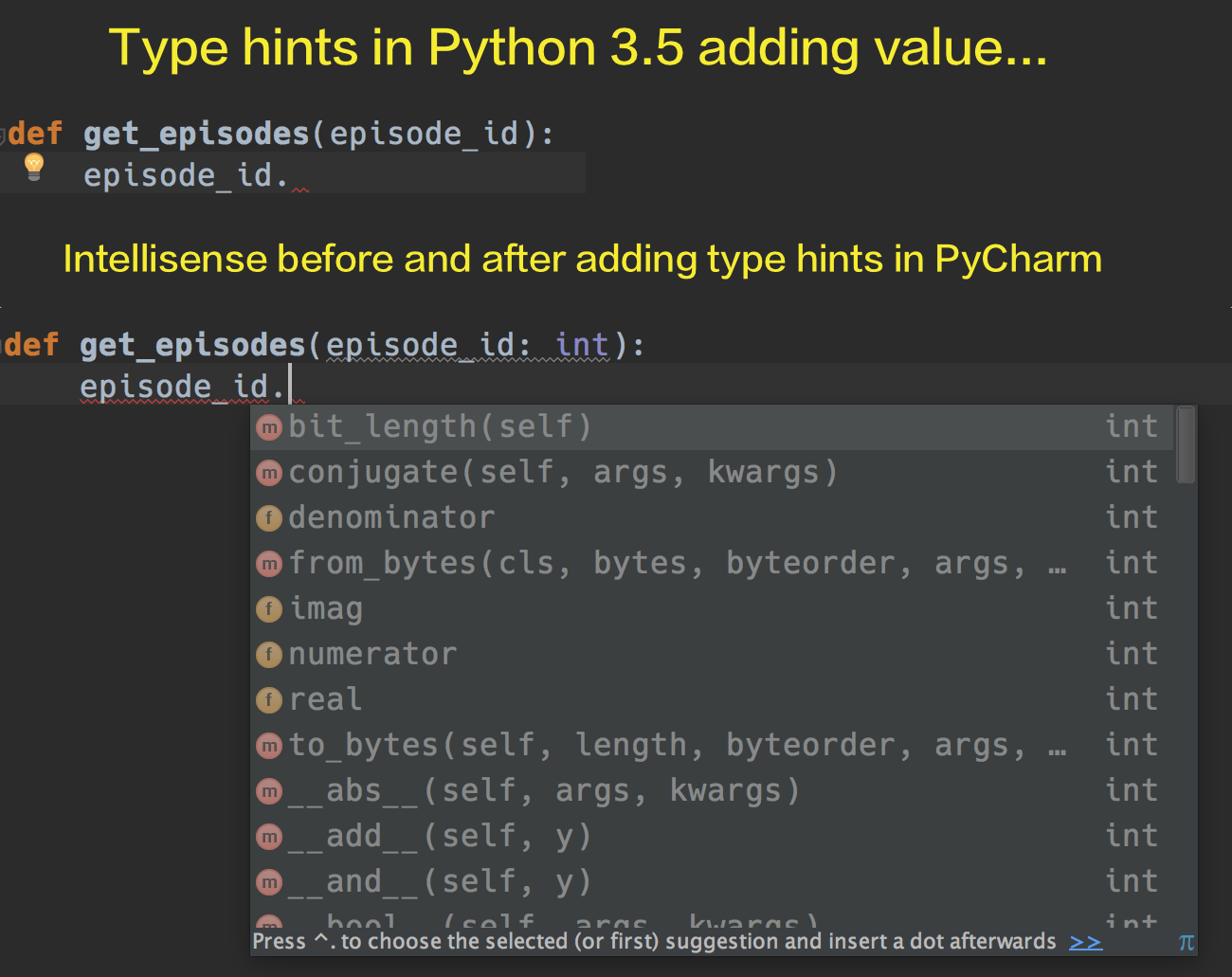 If code completion fails you, type hints (as in episode_id: int ) will turn it right back on. Notice the dropdown lists methods from the int class.