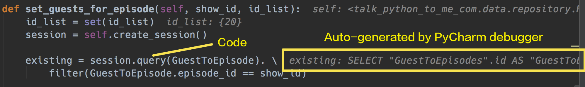 Set a breakpoint, pause in the debugger and you’ll see the SQL language representation of your SQLAlchemy ORM expression. Yeah, that’s amazing.