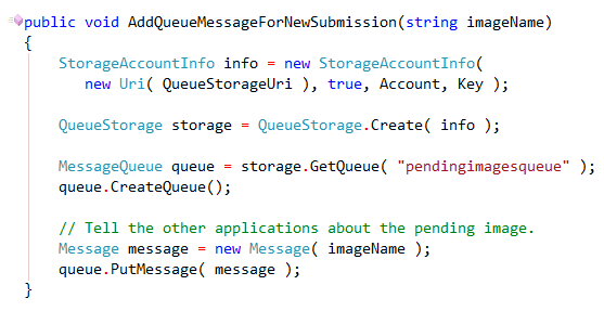 Next, let’s look at how we monitor and pull messages from Azure Queuing. Ultimately we must poll the queue using a RESTful HTTP request. But the StorageClient resurfaces this to us as simple events.