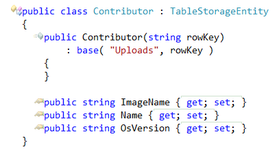 First we’ll define a client-side schema for our entry by creating a class called Contributor which derives from the class TableStorageEntity (from the StorageClient library).