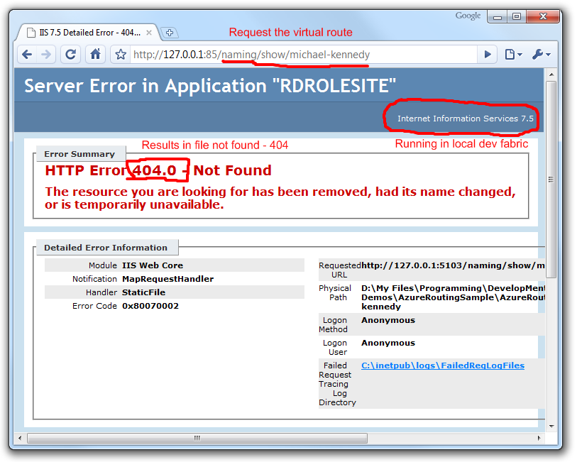 Now if you run your app, you might expect the routing infrastructure to work. Inside the ASP.NET Dev Server (aka cassini) this will likely work. But in the Azure Development Fabric you’ll see this: