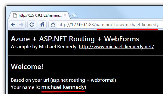 That’s it! You can see our routes working in our WebForms app running in Azure (well, technically the screenshot is the dev fabric – but it works in the cloud as well):