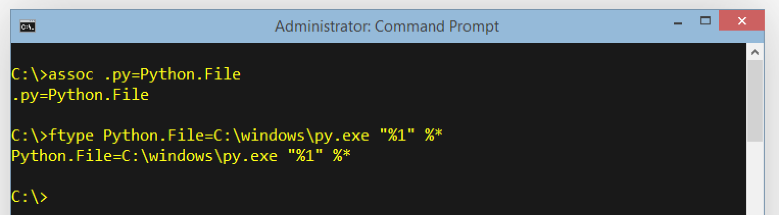 Luckily, we can teach Windows to use the Python Launcher rather than locking to a particular installed version of Python. In an admin command prompt, run these two commands.