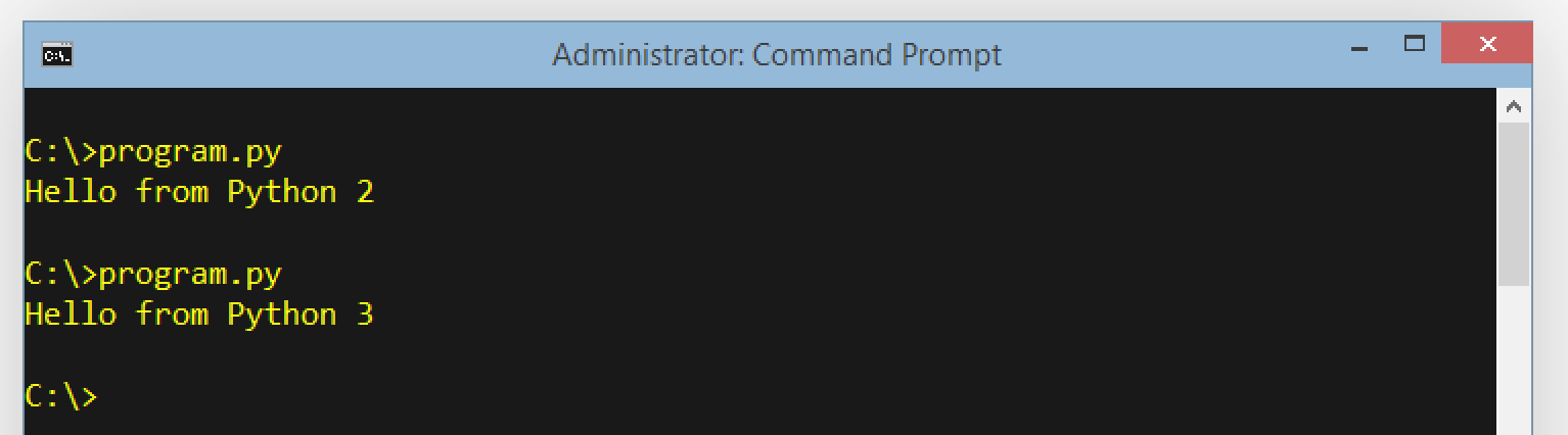 Now if we have the Python 2 shebang or Python 3 shebang, we get the perfect behavior. This is as long as we directly specify the Python launcher (c:\windows\py.exe)