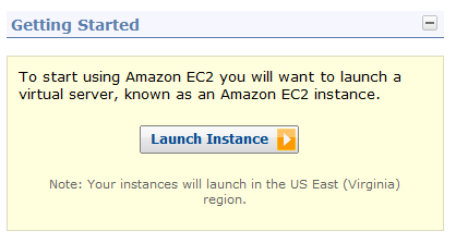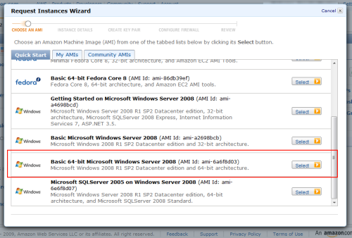 Use the AWS Management Console to launch and manage your virtual images: aws.amazon.com/ec2/home [defunct link: http://aws.amazon.com/ec2/home]. As the console says, choose “Launch Instance” under the “Getting Started” section. You will be presented with a list of pre-configured images. We’ll start with a stock Amazon Windows 2008 server image.