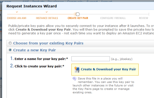 Use the Request Instances Wizard to configure the newly created instance which includes configuring the security, choosing an encryption key, opening ports in the firewall, and kicking off the new instance. Below you’ll see the encryption key step – be sure to download the key pair as you’ll need it for retrieving the administrator password.