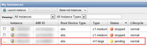Now if you choose “View your instances…” you’ll see that your instance is being prepared – it has a yellow pending status. This screen doesn’t always refresh on its own so use the refresh button in the upper right of the console (rather than your browser’s refresh button).