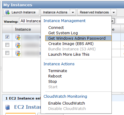 Now you’ll want to login. Of course, the system was created with an administrator account which has a strong password. You’ll need to retrieve that password using the “Instance Actions -> Get Windows Admin Password” option.