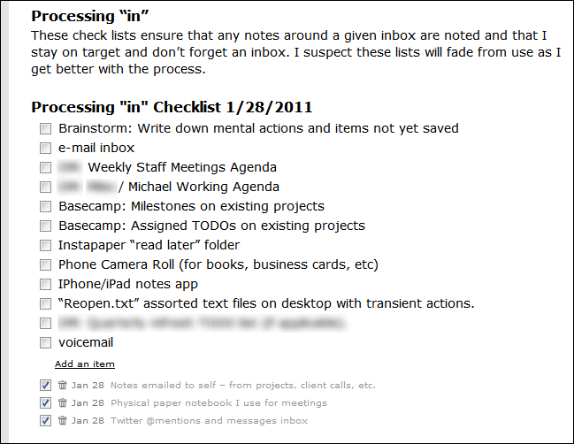 A check list is any set of steps you need to remember. Sometimes it’s for one-off situations, others it’s repeating. Processing all the new stuff in your varied inboxes is a repetitive action. So I made a check list for that. Check lists, as you can see below, are TODO lists in backpack. When they are repeated, I make a template like the actual list but with the title prefix [template]. Then I make a copy to “do” the check list each time.