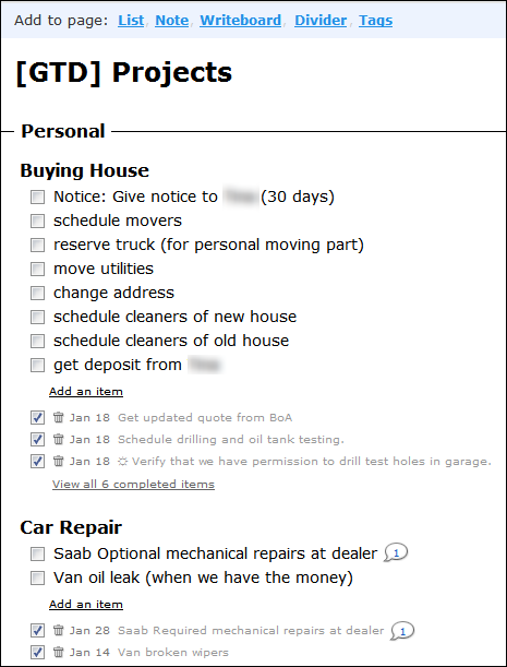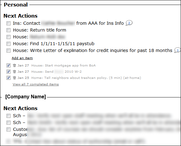 Notice that I have a personal and business one (actually several). One rule of GTD is that if your home life is a mess, it’ll affect your business life and visa versa. So manage it all here. Note also that you can add comments and attach files to the items to track additional info you might need.