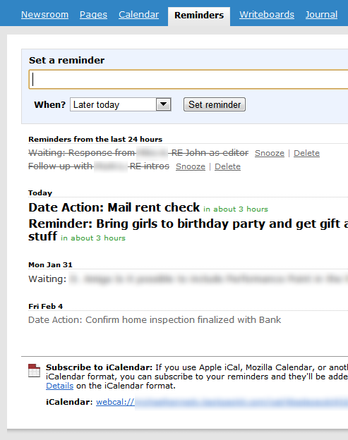 What about calendars? I make extremely heavy use of calendars for GTD. But not within Backpack. I use Google calendar, which then I sync to Outlook, my iPhone, my iPad, and I can also access via the web. If this had been an appointment, I would have skipped the reminders and just put it on my calendar. But it’s an action with a date, so it goes in the reminders.