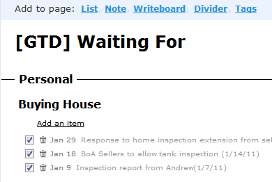 As you saw in the basic structure, projects get their own page (internally partitioned). Thus I have a page entitled ‘[GTD] Projects’. This one is pretty simple. I keep track of all the ‘open-loops’ that require 2 or more actions to complete. Each one gets its own TODO list within Backpack and those lists are partitioned by work and personal.