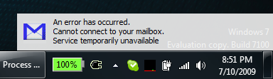 I’ve been using Windows 7 as my sole operating system since Beta 1 in January. I’m completely loving it and I was pleased to see how many apps worked seamlessly on it. One that didn’t and I really miss is Gmail Notifier [defunct link: http://toolbar.google.com/gmail-helper/notifier_windows.html]. No matter how I try, I always get this: