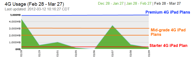 You can see several days of normal usage would bust the monthly limit of the premium plans. Most days that I have used the device all day would bust the mid-grade plan (not the cheapest, which is 250 MB, but the 3 GB plan).