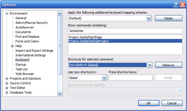 Typically you do this by right-clicking on the project and say “Set as Startup Project”. But did you know you can set a hot key for this? Just go to the keyboard options in VS 2005 and type “SetAsStar” and you’ll see this screen: