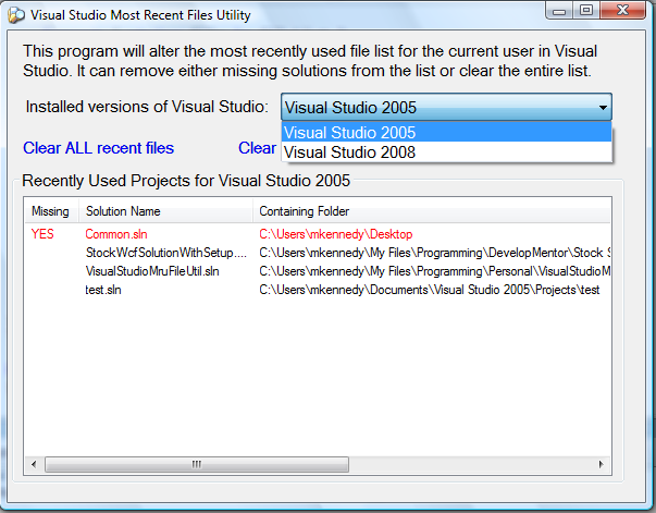 You’re welcome to **download this program ** [defunct link: http://michael-kennedy.s3.amazonaws.com/blog/more-downloads/VisualStudioMruUtility/VisualStudioMruUtility/VisualStudioMruFileUtil.application]if it looks useful to you. I decided to publish it via ClickOnce so it will always be up-to-date. If you’re using FireFox, you’ll need to **FFClickOnce ** [defunct link: https://addons.mozilla.org/en-US/firefox/addon/1608]add-on to make this work.