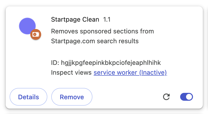 This is where agentic coding comes in. Instead of continuing to be frustrated yet again after doing a search, I fired up Claude Code inside of my editor and asked for a web browser extension that would remove just the ads from Start Page. I gave it the exact example HTML that is used. I described what I want, I hit enter, and I walked away.